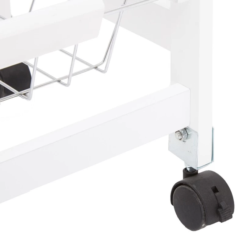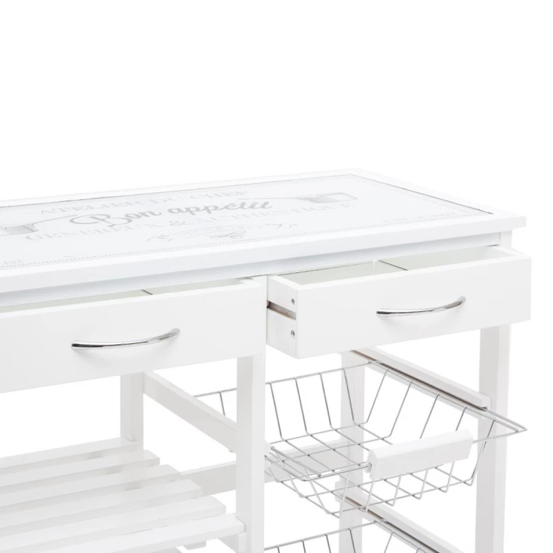 Élégante et extrêmement pratique, cette desserte de cuisine blanche avec plateau en verre dispose de nombreux avantages pour vous faire succomber. Avec ses 2 niveaux sous-jacents, ses 2 tiroirs et ses 3 paniers sur rails en métal, vous disposerez de tout le nécessaire à portée de mains afin de cuisiner sereinement. Grâce à ses 4 roulettes, vous pourrez l’emporter partout dans votre habitation. Elle vous est proposée en accessoires en coloris noir afin d’associer à tout style de déco ! A monter soi-même, notice incluse.