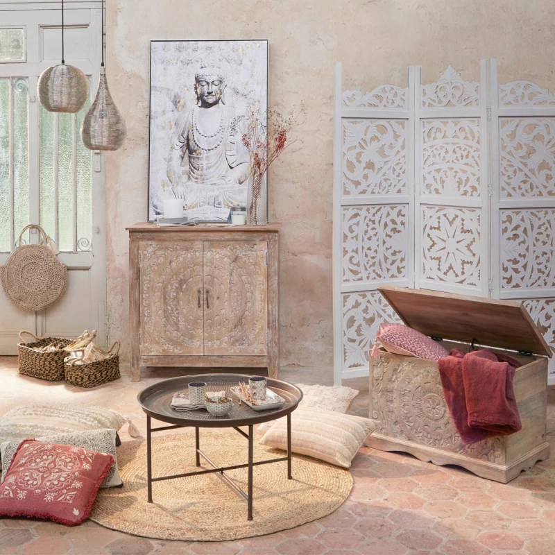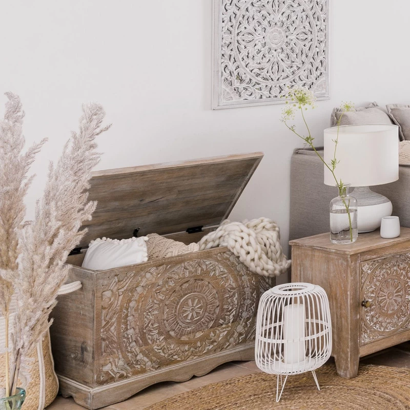 Coffre chambre Shirel de marque Atmosphera. Coffre en bois blanchi.