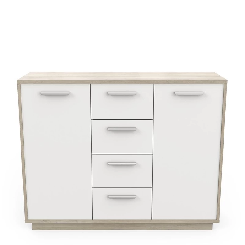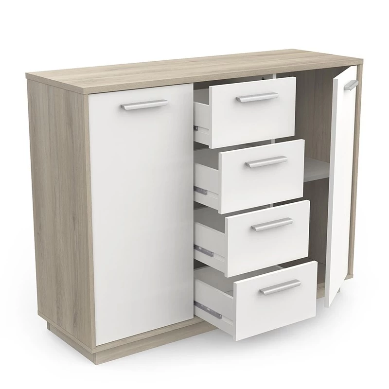 Avec son style épuré, le buffet bas 2 portes 4 tiroirs Léo s’intègre facilement dans un intérieur.