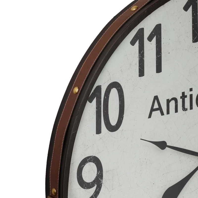 Grande horloge de 92 cm de diamètre cerclée d’une ceinture en simili cuir.