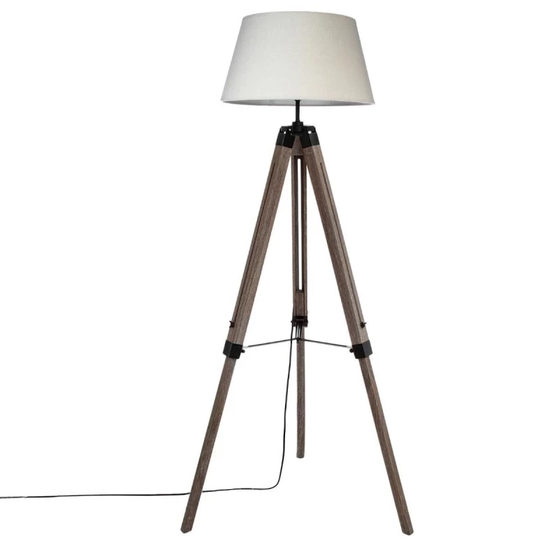 Pieds en bois massif réglables en hauteur. Grand abat-jour beige de 46 cm.