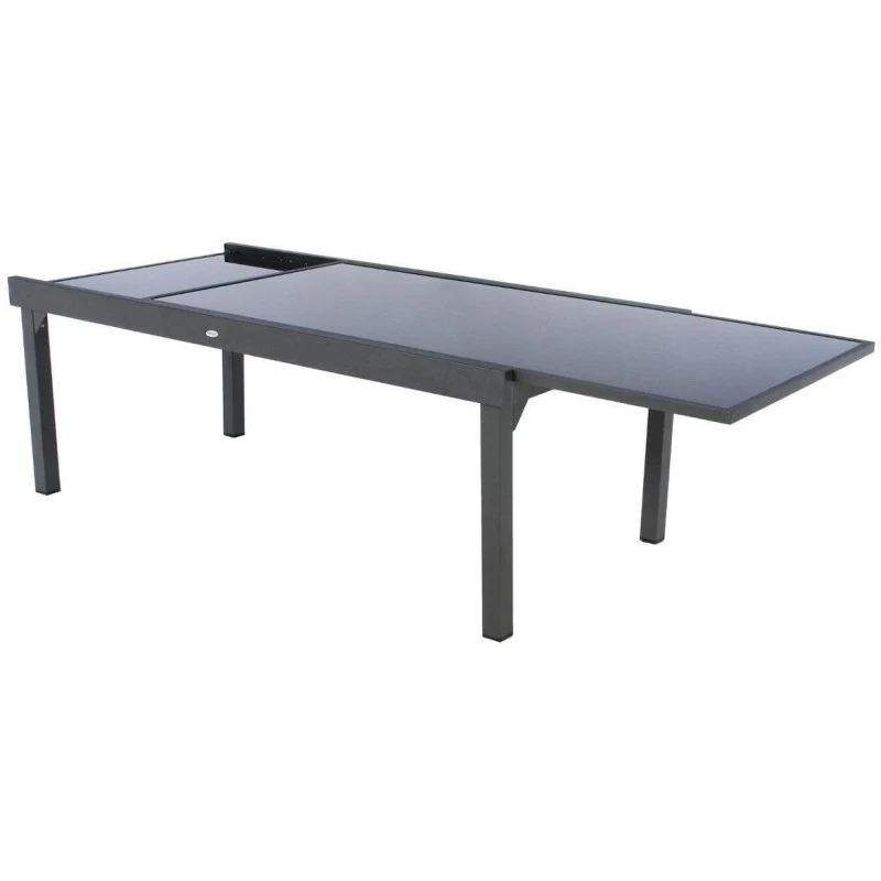 Profitez de bons moments en plein air avec la table rectangulaire extensible 12 personnes Piazza en verre trempé et aluminium en coloris graphite de la marque Hespéride.
