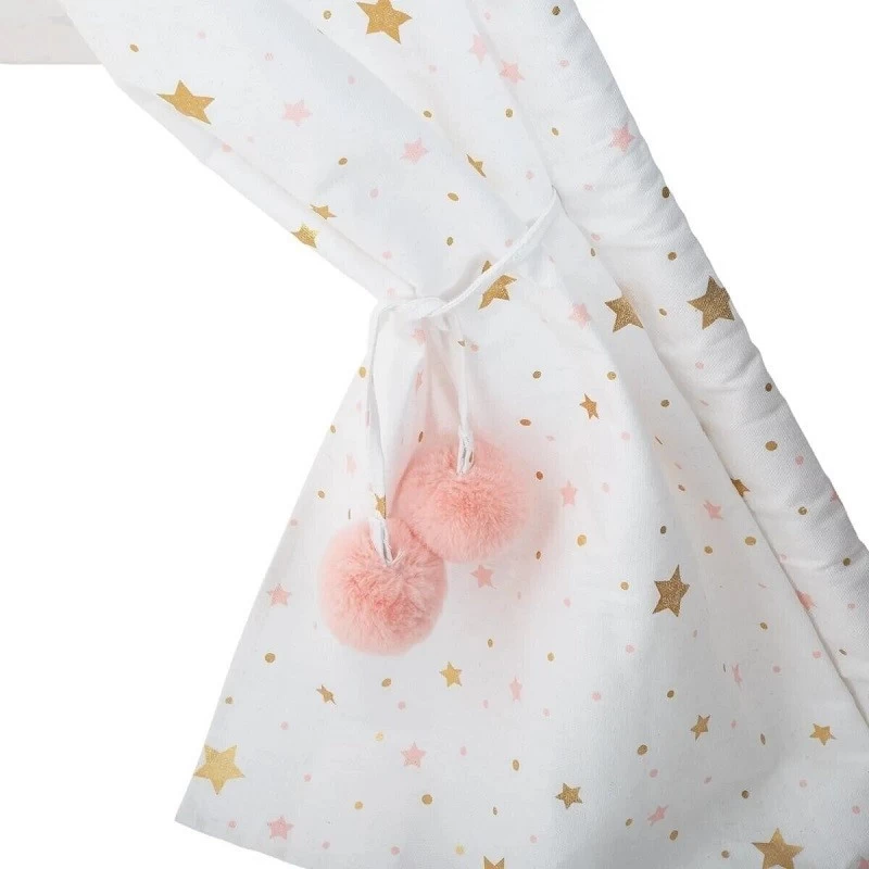 Le tissu blanc comporte des motifs étoilés de couleur rose et dorée .