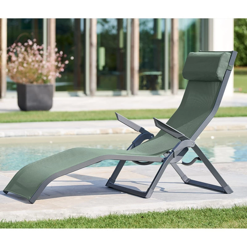 Détendez vous au soleil grâce à ce transat 2 positions Decima en coloris olive / graphite de la marque Hespéride.