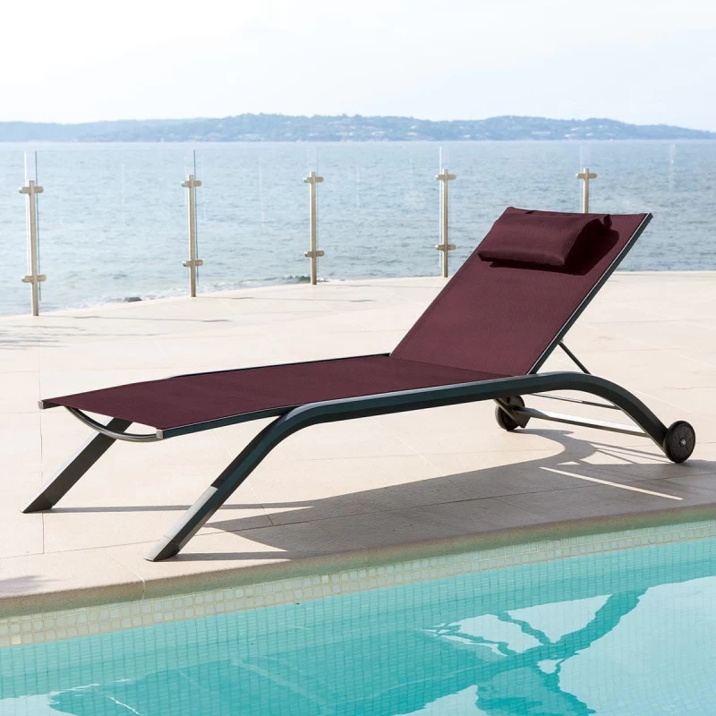 Profitez des beaux jours grâce à ce transat bordeaux et structure graphite de la marque Hespéride.